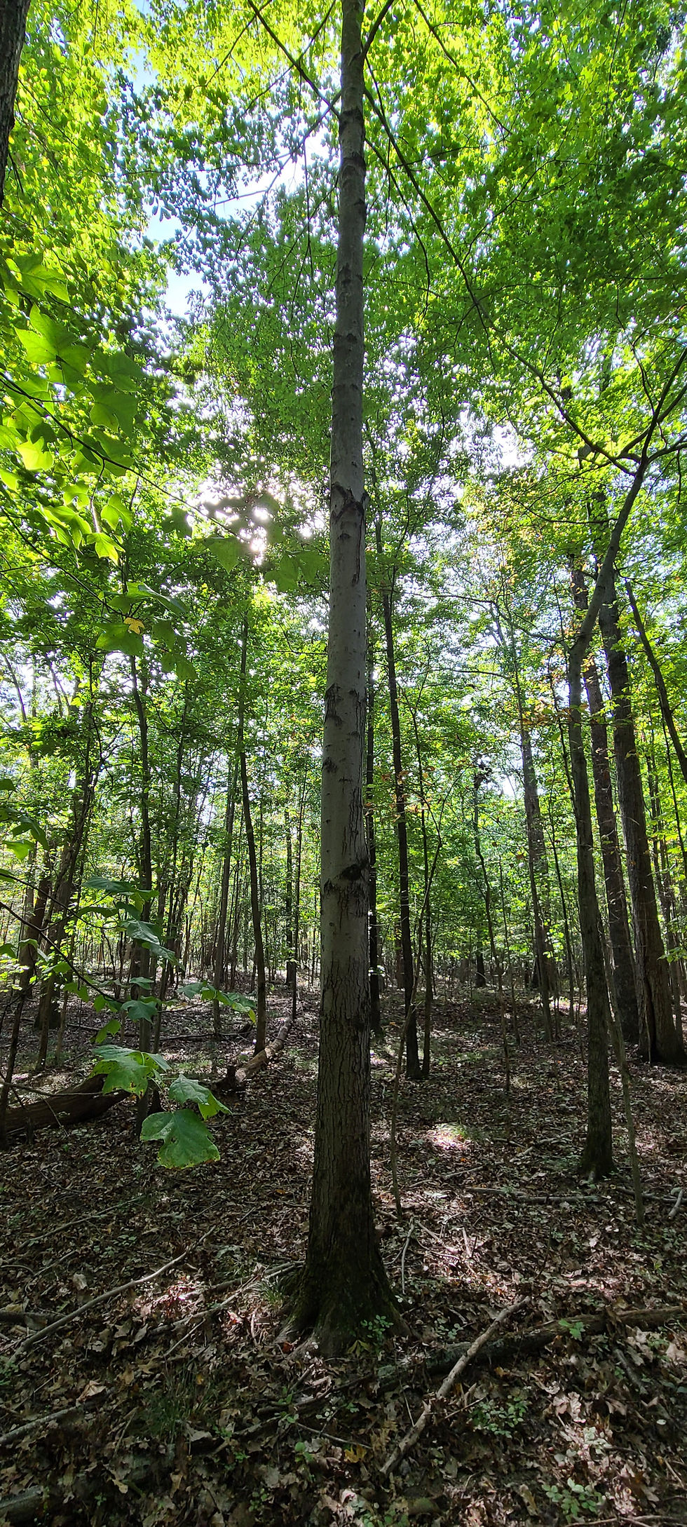 A mix of oaks, hickories, maples, pines, and holly, with dogwoods and tulip poplars adding seasonal color and variety across the area.
